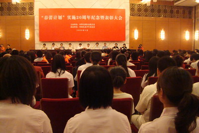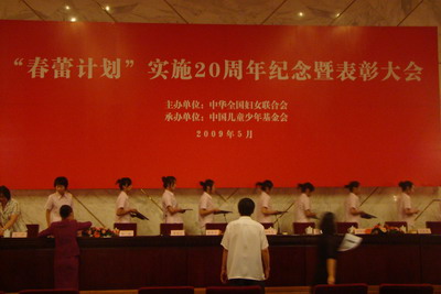 “春蕾計劃”實施20周年紀念暨表彰大會于2009年5月31日下午2點30分在人民大會堂隆重舉行。北京培黎職業學院獲得全國婦聯頒發的“中國兒童慈善獎”,院長、黨委書記余臨代表學院上臺領獎。常務副院長尤錫良、學院董事會辦公室主任楊彥青、財會金融系主任黃賢明、財會金融系副主任兼春蕾班班主任劉樂山等參加了會議。北京培黎職業學院2008級春蕾班31名同學參加會議,并擔任了大會的禮儀服務。