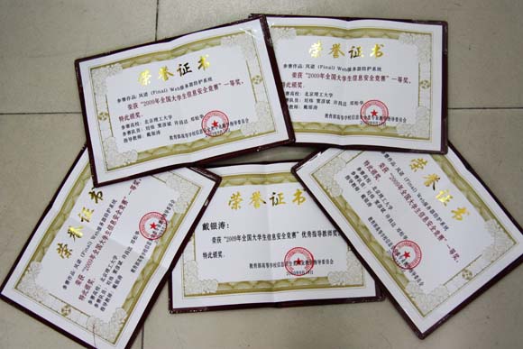 “風諾”Web服務防護系統是由北京理工大學軟件學院信息安全系戴銀濤老師指導,由北京理工大學軟件學院本科2007級的許昌達、劉煒、竇彥斌、鄧松華自主開發的大學生科技創新作品。2009年全國大學生信息安全競賽是由教育部高等學校信息安全類專業教學指導委員會主辦,大賽評審專家組組長為教指委主任委員沈昌祥院士。本次大賽從報名到決賽歷時5個月,參加本次比賽的共有來自全國86個高校的548支隊伍。通過初賽、復賽的篩選,最終只有108支競賽隊進入決賽,決賽于2009年8月15日至8月17日在北京郵電大學舉辦,來自全國各大高校的108支代表隊、400余名隊員上演了一場智慧與創造力的較量。大賽決出了一等獎12名,二等獎24名,三等獎48名。