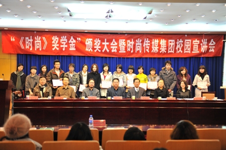 2009年12月4日下午,中國傳媒大學44號樓一層報告廳舉行了第四屆“《時尚》獎學金”頒獎大會暨時尚傳媒集團校園宣講會,中國傳媒大學黨委副書記田維義,學生工作處副處長姜鵬,電視與新聞學院副院長、博士生導師何蘇六,影視藝術學院美術系主任張歌東以及廣告學院創意總監肖虎,時尚傳媒集團《華夏地理》助理出版人兼廣告總監馬艷麗,人力資源總監劉蓉,《時尚先生》客戶經理曹文婷出席了大會。大會分為頒獎和宣講兩個部分,傳媒大學15名來自電視與新聞學院,廣告學院以及影視藝術學院的同學獲得了此項獎學金。
