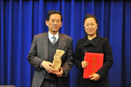 頒獎會上,學生工作處副處長姜鵬介紹了時尚傳媒集團的基本情況,時尚傳媒集團和學校領導為15名獲獎學生頒獎并合影留念。肖虎老師在致辭中說“《時尚》獎學金”傳達的是時尚界對學生的關注,不僅僅是金錢層面上的,“更是起到了一種引領的作用”,希望獲獎學生再接再厲,注重自己知識的積累和情操的培養。時尚集團代表馬艷麗說,中國傳媒大學給她留下了深刻的印象,中傳的學子熱情并富有創造力,這里就像一個家一樣培養了很好的學生。頒獎儀式在田維義副書記與時尚傳媒集團互贈禮物的熱烈氣氛中結束。
