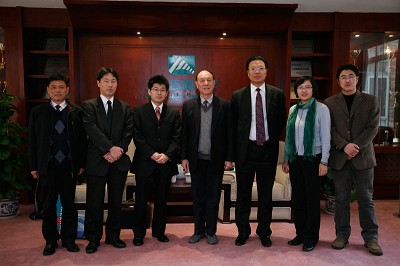 吉利大學校長江樹人教授(中)、副校長徐志國(右三)、校長助理莊小健(左一)親切會見了日本駐華大使館橫井理夫先生(左二)及日本文部科學省新井聰先生(左三)一行并合影留念