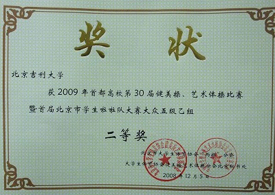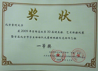 近日在北京大學舉辦2009年首都高校第30屆健美操、藝術體操比賽暨首屆北京市學生啦啦隊大賽,其中清華大學、北京大學、北京體育大學等29個首都高校參加了此項賽事。北京吉利大學健美操代表隊在教練員郝征老師的帶領下分別取得了啦啦隊、啦啦操自選動作乙組一等獎,大眾五級規定動作二等獎的優異成績。
