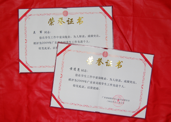 會上對在2009年學生工作中表現突出的個人進行表彰,珠海學院管理與經濟學院總輔導員黃蓬亮、設計與藝術學院總輔導員吳軍被評為 “2009年廣東省高校學生工作先進個人” 。