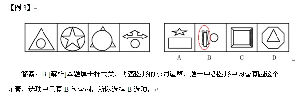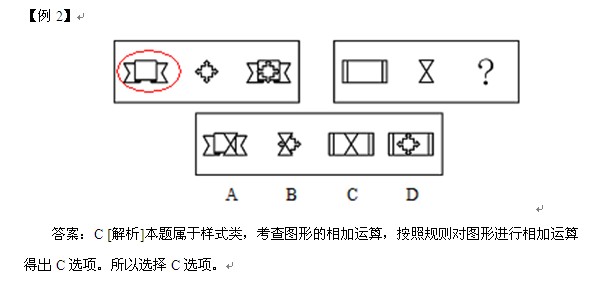 下面例題中出現的圖形(紅色標志),在考試中出現的頻率是很高的。而對于圖形而言,考查的內容相對固定,以此圖為例,首先需要考生明確一點,在未明確指出(圖中出現虛線)圖形是立體圖形時(重構推理除外),題目中出現的圖形均為平面圖形,其實就此圖形本身而言,位置類題目基本不會出現,而數量中的點、線、角、素考查相對少(數目過大或有歧義),能考的以面為主,可以歸為封閉空間;其次只能是圖形本身的屬性,直線圖形,軸對稱圖形以及封閉圖形;最后樣式類的運算。牢記這三點,在考試過程中,尤其是題干中出現此圖形按照步驟去做即可。