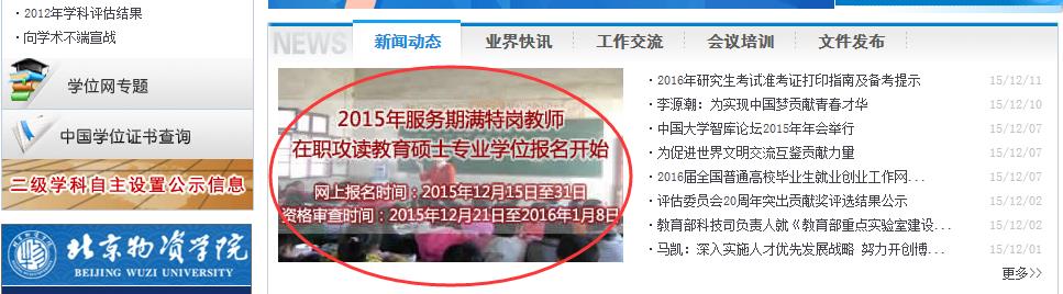 第二步:點擊該網頁左欄“站內導航”中的“2015特崗教師教育碩士報名”或者滾動欄中的“2015年特崗教師在職攻讀教育碩士專業學位報名開始”(下圖中紅色橢圓形線標注的部位)